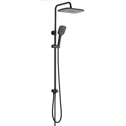 Выдвижная телескопическая стойка (нерж. сталь, черный): высота штанги 1400мм, диаметр 22мм, вылет верхнего душа 330мм, держатель лейки плавающий FightFix. Лейка верхнего душа(ABS-пластик,черный): на подвижном шарнире, ширина 300мм, форсунки Self-Clean Device, Eco system. Ручная лейка: размер110х110мм, форсунки Self-Clean Device, Eco system. Переключатель с ручного на верхний душ: кнопочный. Комплектация: душевой шланг 150см и шланг для подкл. к смесителю (металл), монтажный комплект.