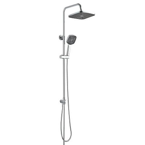 Выдвижная телескопическая стойка (нерж. сталь, хром): высота штанги 1400мм, диаметр 22мм, вылет верхнего душа 330мм, держатель лейки плавающий FightFix. Лейка верхнего душа(ABS-пластик,хром): на подвижном шарнире, ширина 230мм, форсунки Self-Clean Device, Eco system. Ручная лейка: размер 105х105мм, форсунки Self-Clean Device, Eco system. Переключатель с ручного на верхний душ: кнопочный. Комплектация: душевой шланг 150см и шланг для подкл. к смесителю (металл), монтажный комплект.