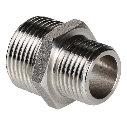 Ниппель переходной из нержавеющей стали в составе системы VT.INOX-PRESS предназначен для соединения элементов с внутренней резьбой разных диаметров. Шестигранный – под гаечный ключ – участок корпуса облегчает монтаж соединения. Материалом фитинга служит сталь марки AISI 304, устойчивая к коррозии, химическому и термическому воздействию. В то же время область рекомендуемого применения фитингов VT.INOX-PRESS исключает трубопроводы жидких углеводородов и хлороводородных растворов.