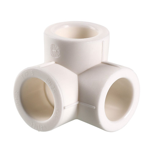 Полипропиленовый фитинг – тройник для разветвления полипропиленового трубопровода в двух плоскостях (тройник двухплоскостной). Монтаж производится методом раструбной сварки. Свариваемые поверхности – внутренние. Серия включает в себя фитинги с условным диаметром 20, 25 и 32 мм.