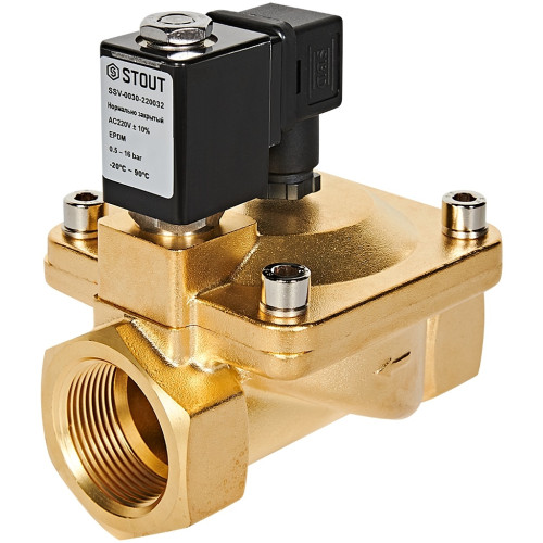 Клапаны двухпозиционные электромагнитные (соленоиды) непрямого действия STOUT, тип SSV-0030 нормально закрытый (НЗ) и SSV-0040 нормально открытый (НО), предназначены для автоматического управления потоками среды, не агрессивной к материалам клапана (воды, масла, нейтральных газов и т. д.). Принцип действия клапана: между входным и выходным патрубком клапана установлена подвижная мембрана, которая открывает и закрывает рабочее седло клапана. Управление мембраной осуществляется при помощи открытия и закрытия перепускных управляющих каналов малого сечения, которые соединены с надмембранным пространством. Открытие/закрытие управляющего канала осуществляется сердечником клапана, который приводится в действие катушкой (соленоидом). У НЗ клапана сердечник перекрывает управляющий канал, мембрана перекрывает рабочее седло, когда подается напряжение на катушку клапана происходит открытие управляющего канала, меняется давление в надмембранном пространстве, и мембрана изменяет свое положение, открывая основной проток через клапан.
