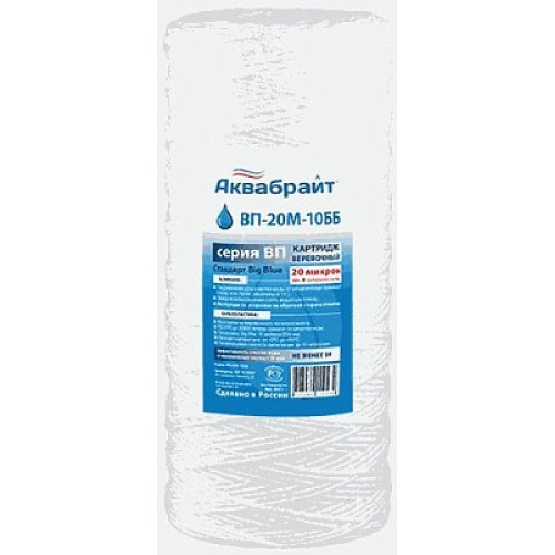 Картридж АКВАБРАЙТ ВП-20М-10ББ изготовлен из веревочного полипропилена с пищевым допуском.