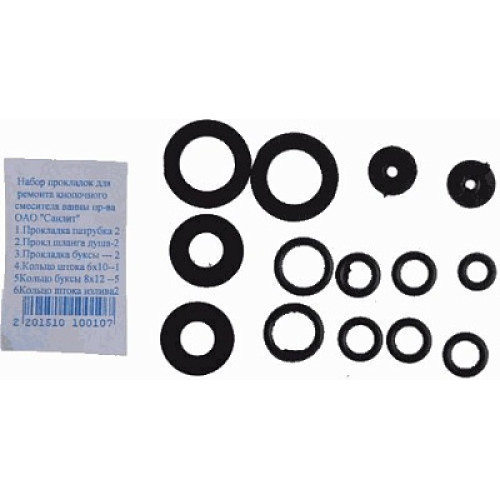Набор прокладок для кнопочного смесителя для ремонта и замены износившихся прокладок кнопочных смесителей. Комплектация: прокладка резиновая 3/4 - 2 шт.; прокладка резиновая 1/2 - 2 шт.; таблетка для кранбуксы 13 мм - 2 шт.; кольцо резиновое для кранбуксы 8x12 - 5 шт.; кольцо резиновое для кранбуксы 6x10 - 1 шт.; кольцо для отечественного излива 12x16 - 2 шт.