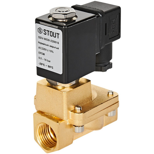 Клапаны двухпозиционные электромагнитные (соленоиды) непрямого действия STOUT, тип SSV-0030 нормально закрытый (НЗ) и SSV-0040 нормально открытый (НО), предназначены для автоматического управления потоками среды, не агрессивной к материалам клапана (воды, масла, нейтральных газов и т. д.). Принцип действия клапана: между входным и выходным патрубком клапана установлена подвижная мембрана, которая открывает и закрывает рабочее седло клапана. Управление мембраной осуществляется при помощи открытия и закрытия перепускных управляющих каналов малого сечения, которые соединены с надмембранным пространством. Открытие/закрытие управляющего канала осуществляется сердечником клапана, который приводится в действие катушкой (соленоидом). У НЗ клапана сердечник перекрывает управляющий канал, мембрана перекрывает рабочее седло, когда подается напряжение на катушку клапана происходит открытие управляющего канала, меняется давление в надмембранном пространстве, и мембрана изменяет свое положение, открывая основной проток через клапан.