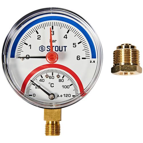 • Термоманометр радиальный STOUT в комплекте с автоматическим запорным клапаном, корпус Dn 80 мм 1/2 , 0...120°C, 0-6 бар