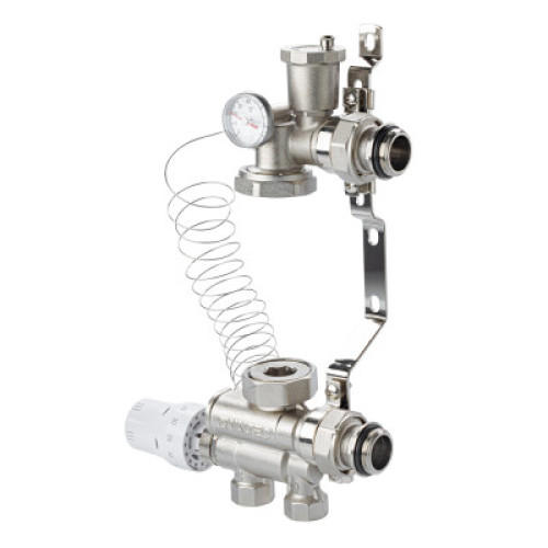 Насосно-смесительный узел VALTEC ECOMIX предназначен для создания в системе отопления здания низкотемпературного циркуляционного контура. Узел обеспечивает поддержание заданной температуры во вторичном циркуляционном контуре, его гидравлическую увязку с первичным контуром, а также позволяет регулировать температуру и расход теплоносителя во вторичном контуре в зависимости от пользовательских настроек. Насосно-смесительный узел VALTEC ECOMIX может использоваться в системах встроенного обогрева: теплый пол, теплые стены, обогрев открытых площадок и.т.д. Насосно-смесительный узел адаптирован для совместного применения с коллекторными блоками с межцентровым расстоянием 200 мм и присоединительной резьбой 1”. Монтажная длина используемого насоса должна быть 130 мм . Узел может работать под управлением контроллеров с погодозависимым регулированием VT.K400 и VT.K500. В этом случае вместо термоголовки с выносным датчиком на термостатический клапан устанавливается электротермический сервопривод VT.TE3043.0.024 или VT.TE3043.A.024.
