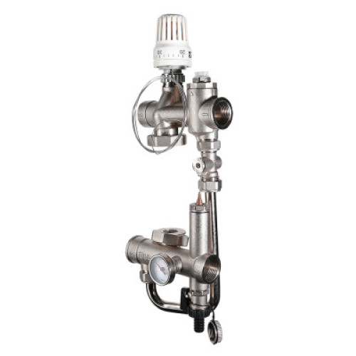 Насосно-смесительный узел адаптирован для совместного применения с распределительными коллекторами петель теплого пола при межцентровом расстоянии между коллекторами 200 мм. Узел поставляется без циркуляционного насоса.