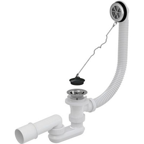 Сифон представляет собой классическую конструкцию, которая закрывает сливное отверстие в ванне, а также отверстие для перелива. Закрытие и открытие сливного отверстия происходит с помощью ПВХ заглушки, прикрепленной цепочкой к переливу. Максимальная высота между отверстием слива и отверстием перелива составляет 370 мм. Решетка перелива изготовлена из пластика с хромированной поверхностью, материал, из которого сделан слив-перелив Alcadrain устойчив к воздействию химических чистящих веществ и перепадам температур.