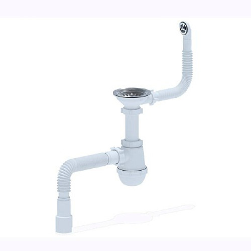 Сифон для кухонных моек с диаметром сливного отверстия 90мм, бутылочного типа с увеличенным корпусом. С разборным выпуском, нержавеющей решеткой, переливом и гибкой трубой 40*40/50мм.