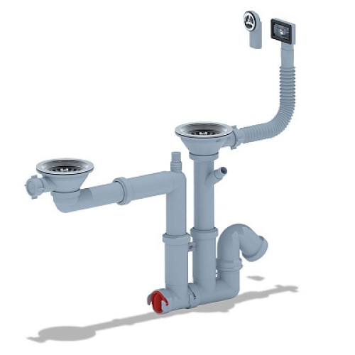 Сифон АНИ пласт F7500S для мойки двойной, смещенный с отводом для стиральной машины, гибким круглым и прямоугольным переливом.