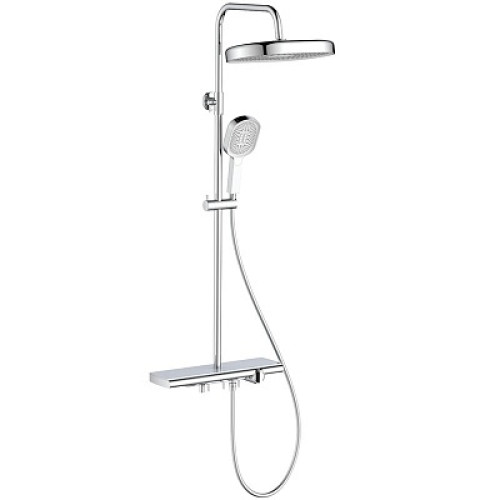 Телескопическая стойка (нерж. сталь, хром): высота 1500мм, диаметр 24мм, держатель лейки плавающий Fight Fix, подвижные крепления Free Mount. Лейка верхнего душа (ABS-пластик, хром): на подвижном шарнире, 360мм. Ручная лейка: диаметр 114мм. Комплектация: армированный душевой шланг 150см, монтажный комплект, подвижный аэратор. Корпус полки - ABS-пластик, трубки PPA.
