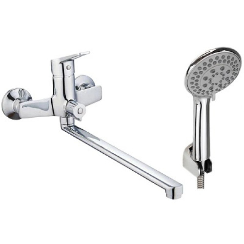 Корпус: латунь кат. A; Излив: поворотный, 320мм; Картридж: универсальный ESKO, 35мм; Переключатель: механический(керамика); Комплектация: эксцентрики, отражатели, шланг душевой (в металл. оплетке - 150см.), лейка душевая (5 функций), настенный держатель для лейки.