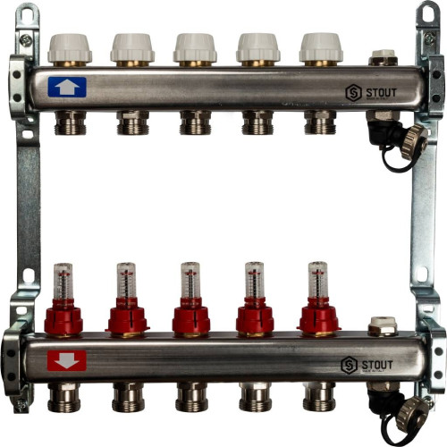 • Коллектор из нержавеющей стали с расходомерами, с клапаном вып. воздуха и сливом STOUT 5 выходов, SMS-0927-000005