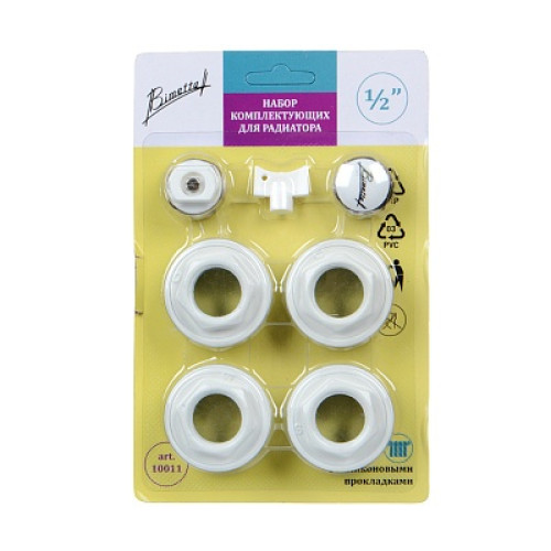 Набор позволяет поностью оборудовать радиатор отопления для применения его по назначению. В состав комплекта входит: - переходник для радиатора правый 1"-1/2" - 2 шт.; - переходник для радиатора левый 1"-1/2" - 2 шт.; - воздухоотводчик ручной (кран Маевского) - 1 шт.; - ключ для ручного воздухоотводчика (кран Маевского) - 1 шт.; - заглушка - 1 шт.