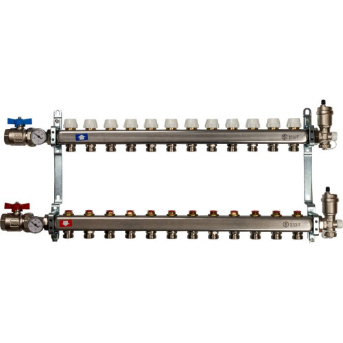 Коллекторные блоки STOUT производятся в Италии под тщательным контролем, проходя многочисленные тесты и сертификацию оборудования. Благодаря этому распределительные коллекторы STOUT обладают рядом преимуществ, среди которых надежность конструкции, качественные материалы, оптимальная комплектация блока, варианты исполнения для теплого пола и для радиаторной разводки. Преимущества коллекторных блоков STOUT — Материал корпуса - нержавеющая сталь AISI 304L. — Правильная конструкция с резьбовыми соединениями. — Качественный европейский производитель. — Высокая пропускная способность. — Давление до 10 бар. — Рабочая температура до 100°С. — Возможность установки сервопривода. — Автоматический воздухоудалитель. — Прямые кронштейны. — В моделях с шаровыми кранами выход шарового крана всегда 1". — Лучшее соотношение цена/качество. — Поставляется заводским комплектом в единой упаковке. — В наличии модели с шаровыми кранами и с термометрами в комплекте. — Подходят к любым комплектам быстрого монтажа (L=200 и 211 мм). Коллекторная группа STOUT SMS 0912 — Полностью укомплектованный коллекторный блок с термостатическими и терморегулирующими вентилями. — Возвратный коллектор: н/ж сталь AISI 304L, с отсечными клапанами под сервоприводы. — Подающий коллектор: н/ж сталь AISI 304L, с запорными вентилями. — 2 цельнометаллических кронштейна. — 2 перекрывающих шаровых кранов. — 2 фитинга с термометром. — 2 концевых фитинга с воздухоотводчиком и сливным краном. — Размер подключения: 1", внутренняя резьба. — Резьбы: ISO228 (эквивалентно DIN EN ISO 228 и BS EN ISO 228). — Выходы: от 3 до 13 с соединением 3/4" евроконус. — Межосевое расстояние: 50 мм. — Возможно использования термоэлектрических сервоприводов с резьбой М30х1,5.