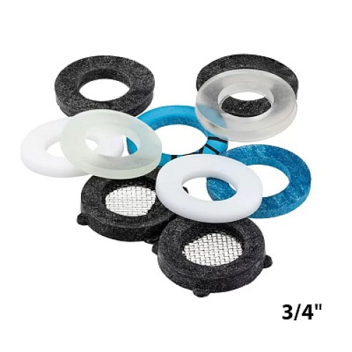 Прокладки предназначены для герметизации резьбовых соединений в системах холодного и горячего водоснабжения. Температурный диапазон: от -45°C до +80°C. Выдерживают давление до 10 бар. Состав набора: прокладка резиновая 3/4" - 2шт., прокладка из фторопласта 3/4" - 2шт., прокладка прозрачная уплотнительная 3/4" - 2шт., прокладка паронитовая безасбестовая 3/4" - 2шт., прокладка для смесителя с сеточкой 3/4" - 2шт.